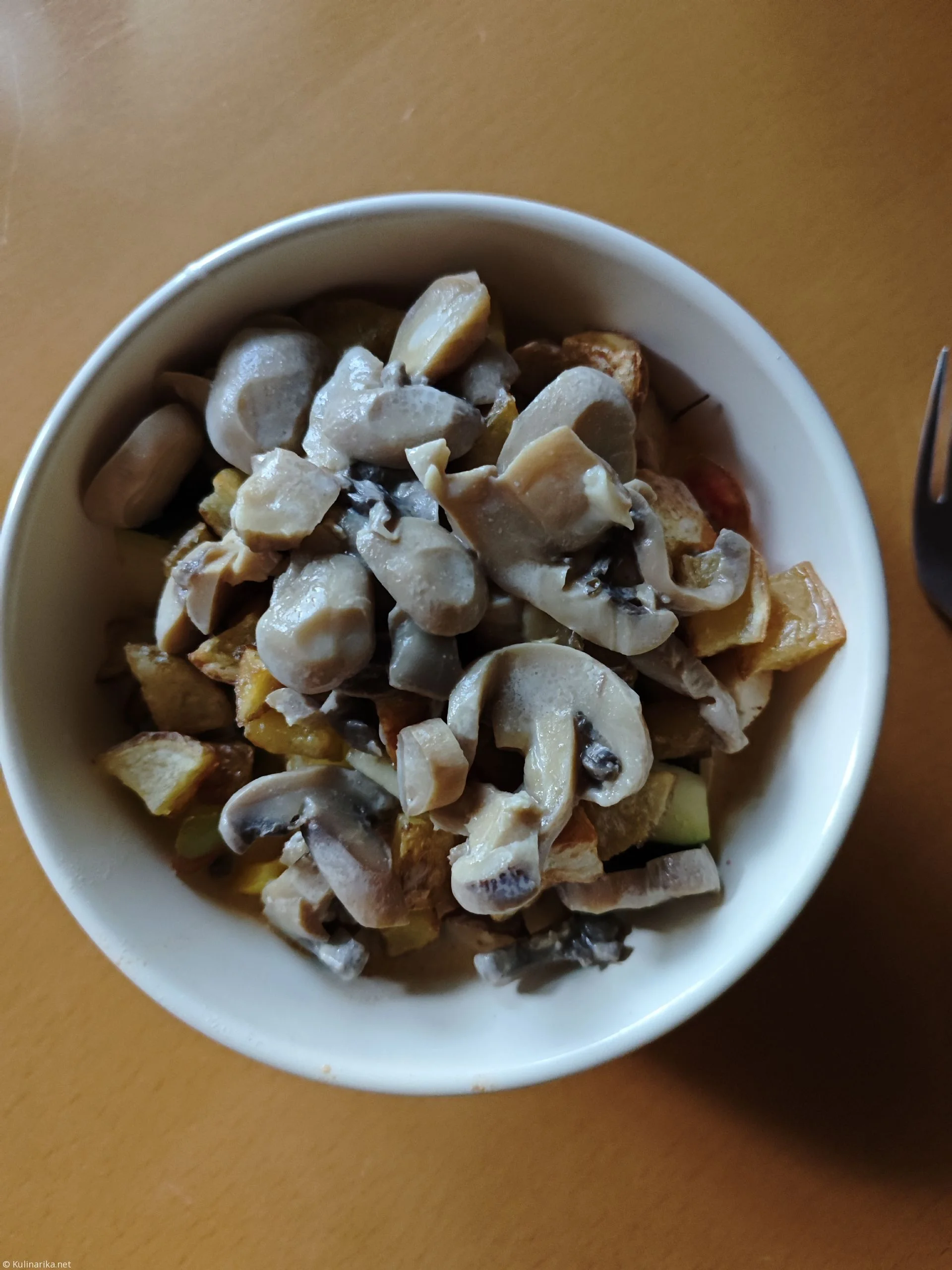 Serviramo v skledi, najprej damo zelenjavo do 3/4 sklede, nato damo krompir, polijemo pa z gobovo omako.