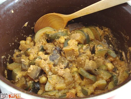 Bučki, paradižnika in melancan narežemo na približno enako velike kose (cca. 3 cm). V posodo vlijemo nekaj olja in ko se segreje, na njem na hitro popečemo zelenjavo. Zalijemo z nekaj malega vode in dodamo paradižnikovo mezgo ter po občutku mleto papriko, sol in česen. Kmalu za tem dodamo še odcejeno čičerko, kislo smetano, tuno in baziliko. Nekajkrat še pomešamo s kuhalnico in umaknemo z ognja. Posujemo z narezanim peteršiljem.