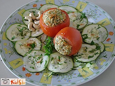 Obema paradižnikoma izdolbemo sredico. Naribamo pol korenčka in bučko na lističe. V sekljalnik damo malo bučk (par lističev), korenje, avokado, oreščke in to dobro sesekljamo. Maso nadevamo v paradižnika. Na krožnik damo na sredino oba paradižnika in okoli bučkine lističe, ki jih pokapamo z limoninim sokom in potresemo s sesekljanim peteršiljem.