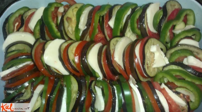 Papriko, paradižnike, bučko, jajčevca in mocarelo narežemo na kolobarje (naj ne bodo preveč debeli). Ko se vsa zelenjava in mocarela nareže, na hitro popečemo jajčevce (do svetlo rjave barve), nato pa zelenjavo po vrstnem redu zlagamo v pekač, napolnjen s pelati, vmes dodamo še mocarelo in pokapljamo z olivnim oljem. Jed na koncu pečemo pri 200 stopinjah 20-25 minut.