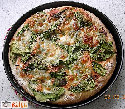 Tako, svežo špinačo naložiš gor. Kot vidiš po sliki jo je kar precej naložene, potem pa se zelo skrči. Res je dobra pica.