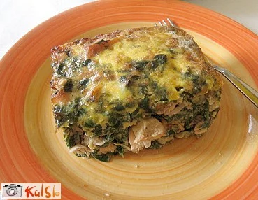 5Popečemo kose piščanca na olivnem olju (ki smo jih prej narezali na koščke) za nekaj minut, dodamo začimbe, nato vodo in pokrito kuhamo še 15 minut. V primerno veliko skledo damo jajca, nariban sir, špinačo in piščanca, nato dobro premešamo. Vse to zlijemo v pomaščen ognjevarni pekač in pečemo 40 minut pri 180 stopinjah.