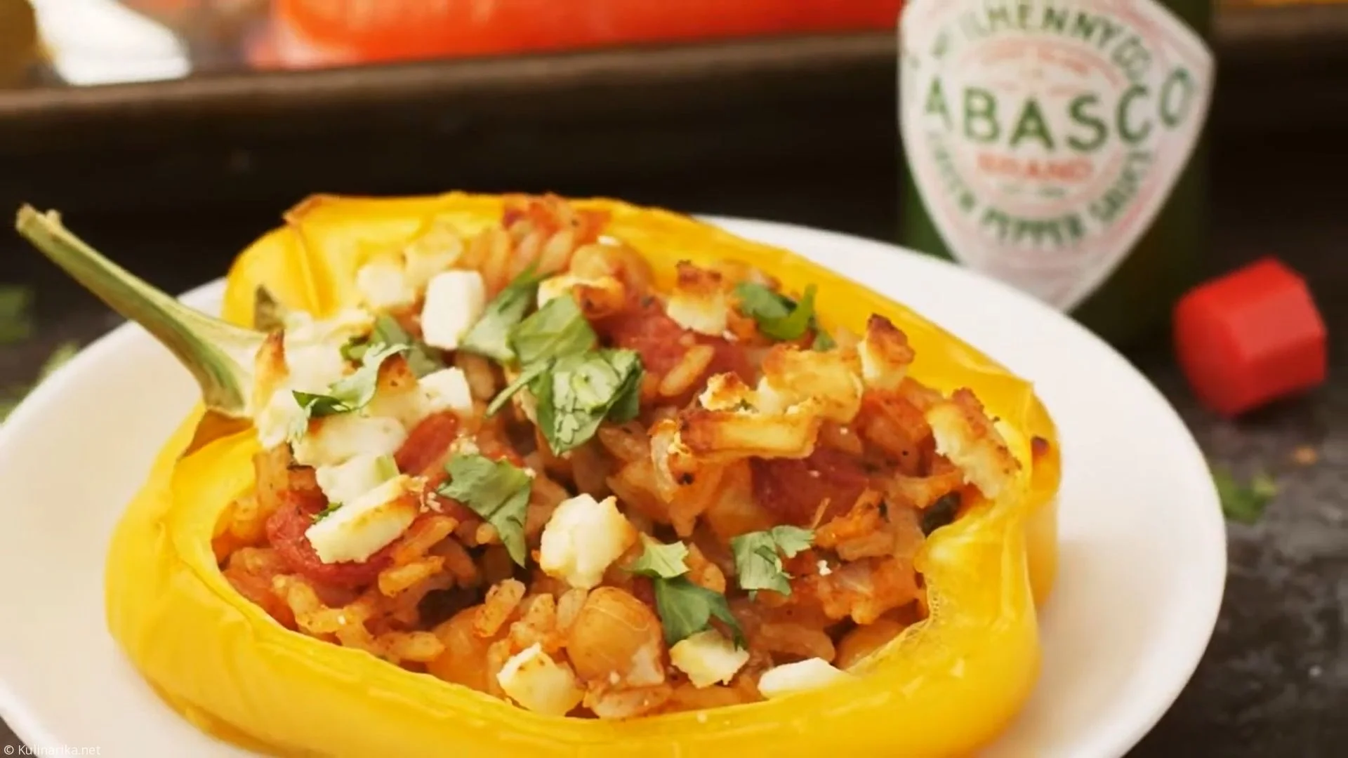 Vsako polovico paprike napolnimo z riževo zmesjo in pazimo, da je ne napolnimo preveč.