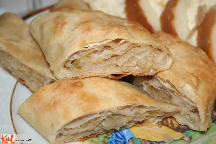 Naredimo vlečeno testo in ga razdelimo na 2 hlebčka, katera premažemo z oljem in pustimo počivati. Ta čas naredimo nadev. Prepražimo čebulo na olivnem olju, dodamo kislo zelje, naribano jabolko, nekaj brinovih jagod, belo vino in malo popra. To naj vre približno 15 minut. Zdaj razvaljamo testo, potresemo ga z drobtinami in na koščke narezanim dimljenim tofujem. Nato porazdelimo kislo zelje z dodatki. Zvijemo in pečemo v srednje vroči pečici približno 30 minut.