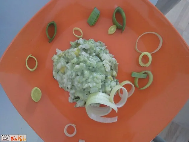 Na olivnem olju pražimo na kolobarje narezan por do mehkega. Dodamo dve merici riža, podušimo in zalijemo z ustrezno količino vode (po želji lahko tudi jušne osnove). Solimo in kuhamo, dokler ne izpari vsa voda.