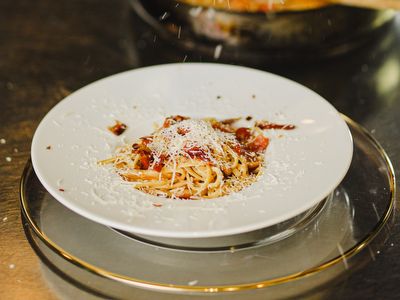 Ploščati špageti s pestom iz bazilike in feferonov, šparglji in lososom